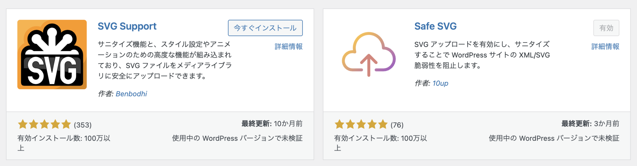 プラグイン検索画面で「SVG」と入力して検索すると、上の方にいくつか出てきますので